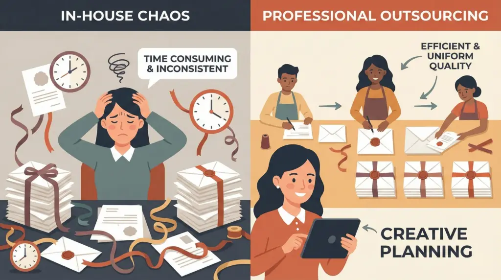 受け取った瞬間の「ときめき」を演出し、特別な体験への期待感を最大限に高める。そのための重要なツールが、人の手で丁寧に作られた招待状です。しかし、このこだわりの実現を社内リソースだけで賄おうとすると、業務効率を著しく下げる原因となります。